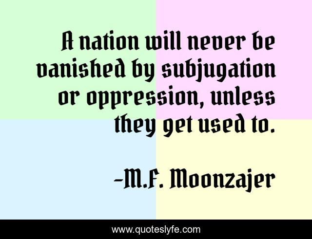 This page presents the quote "A nation will never be vanished by subjugation or oppression, unless they get used to.". Author of this quote is M.F. Moonzajer. This quote is about oppression, vanish, subjugation, nation,.