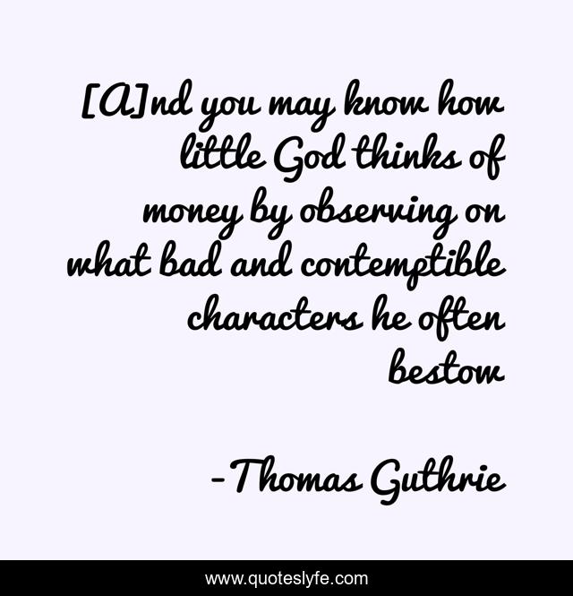 This page presents the quote "[A]nd you may know how little God thinks of money by observing on what bad and contemptible characters he often bestow". Author of this quote is Thomas Guthrie. This quote is about money, contempt, greed, materialism,.