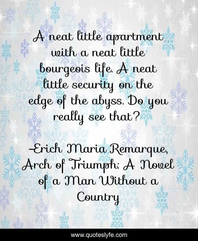 This page presents the quote "A neat little apartment with a neat little bourgeois life. A neat little security on the edge of the abyss. Do you really see that?". Author of this quote is Erich Maria Remarque, Arch of Triumph: A Novel of a Man Without a Country. This quote is about bourgeois-life, love, lost-generation, security, war, affection,.