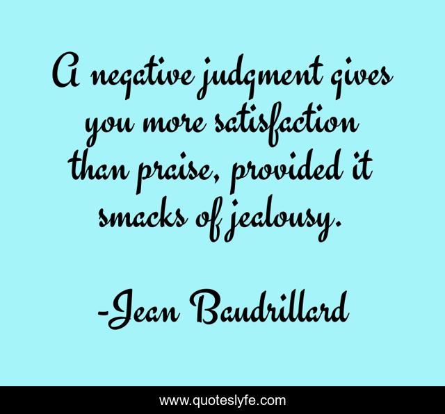 This page presents the quote "A negative judgment gives you more satisfaction than praise, provided it smacks of jealousy.". Author of this quote is Jean Baudrillard. This quote is about satisfaction, negative,.