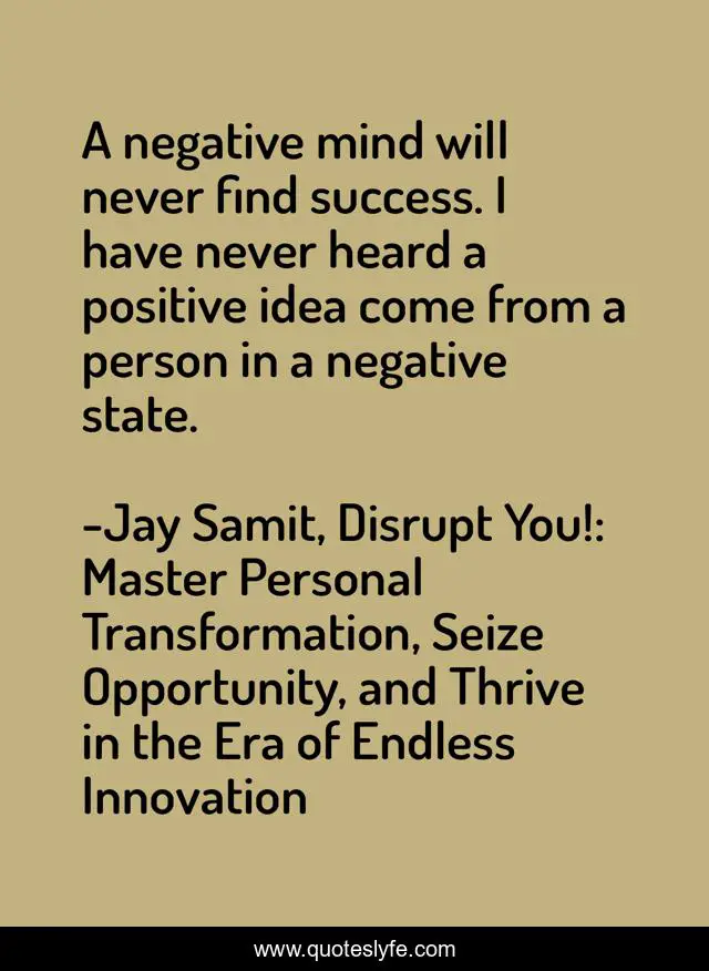 "Jay Samit, Disrupt You!: Master Personal Transformation, Seize Opportunity, and Thrive in the Era of Endless Innovation Quotes." Quoteslyfe.com, 2025. Mon. 08 Dec. 2025. <https://www.quoteslyfe.com/quote/A-negative-mind-will-never-find-success-106515>.