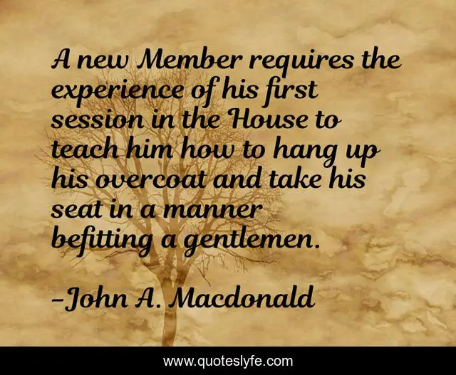This page presents the quote "A new Member requires the experience of his first session in the House to teach him how to hang up his overcoat and take his seat in a manner befitting a gentlemen.". Author of this quote is John A. Macdonald. .