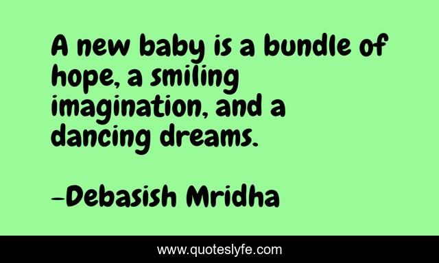 This page presents the quote "A new baby is a bundle of hope, a smiling imagination, and a dancing dreams.". Author of this quote is Debasish Mridha. This quote is about imagination, philosophy, debasish-mridha, quotes, dancing-dreams, debasish-mridha-md, inspirational, enthusiasm, bundle-of-hope,.