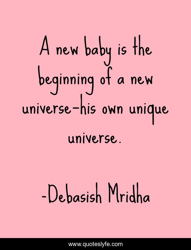 This page presents the quote "A new baby is the beginning of a new universe—his own unique universe.". Author of this quote is Debasish Mridha. This quote is about miraboli, a-new-baby-is-the-beginning, oscar-wilde, philosophy, debasish-mridha, quotes, debasish-mridha-md, inspirational, new-baby,.