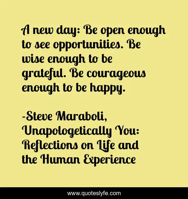 This page presents the quote "A new day: Be open enough to see opportunities. Be wise enough to be grateful. Be courageous enough to be happy.". Author of this quote is Steve Maraboli, Unapologetically You: Reflections on Life and the Human Experience. This quote is about life, wise, new-day, opportunities, grateful, courageous, happy,.