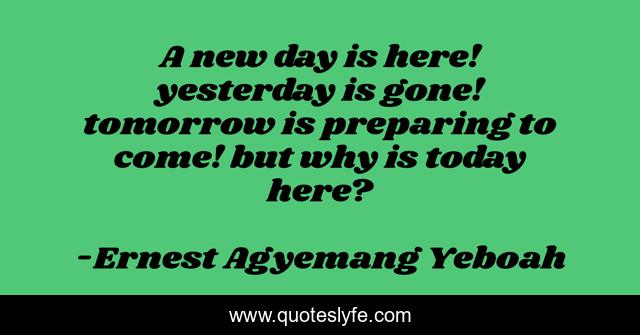 This page presents the quote "A new day is here! yesterday is gone! tomorrow is preparing to come! but why is today here?". Author of this quote is Ernest Agyemang Yeboah. This quote is about what-to-do-in-the-day, life, a-new-day, living-well-in-the-day, time-management, wisdom, a-new-day-is-here, purpose-driven-life, life-and-living,.