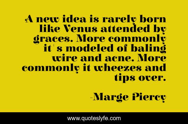 This page presents the quote "A new idea is rarely born like Venus attended by graces. More commonly it's modeled of baling wire and acne. More commonly it wheezes and tips over.". Author of this quote is Marge Piercy. .