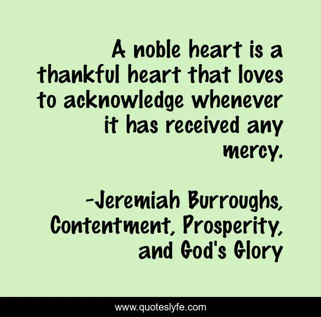 This page presents the quote "A noble heart is a thankful heart that loves to acknowledge whenever it has received any mercy.". Author of this quote is Jeremiah Burroughs, Contentment, Prosperity, and God's Glory. This quote is about thankfulness, mercy, thankful-heart, grateful,.