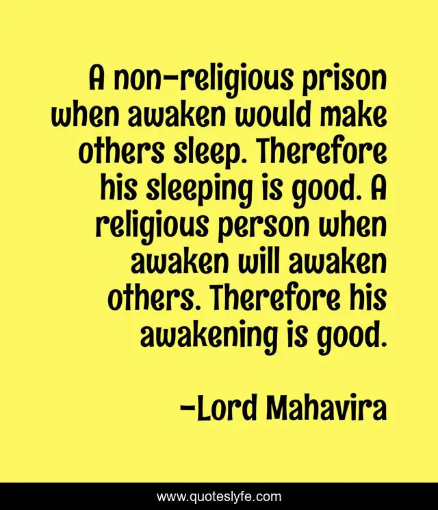 This page presents the quote "A non-religious prison when awaken would make others sleep. Therefore his sleeping is good. A religious person when awaken will awaken others. Therefore his awakening is good.". Author of this quote is Lord Mahavira. This quote is about love, mahavira, yin-yang, broad-mindedness, sleeping, awakening, ultimate-answer, religious, seeking-truth,.