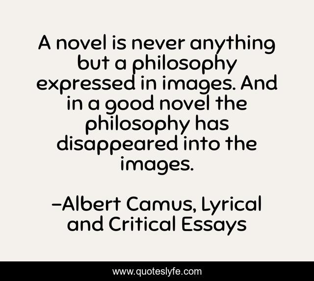 This page presents the quote "A novel is never anything but a philosophy expressed in images. And in a good novel the philosophy has disappeared into the images.". Author of this quote is Albert Camus, Lyrical and Critical Essays. This quote is about philosophy, novels,.