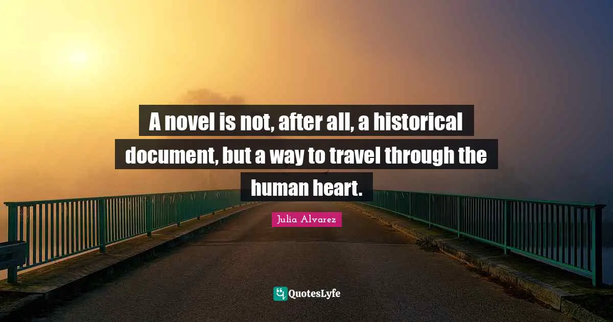 This page presents the quote "A novel is not, after all, a historical document, but a way to travel through the human heart.". Author of this quote is Julia Alvarez. This quote is about human heart, way, novel, travel, historical, heart,.