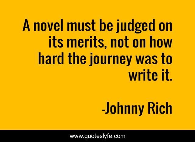 This page presents the quote "A novel must be judged on its merits, not on how hard the journey was to write it.". Author of this quote is Johnny Rich. This quote is about literature, novels, hard, merit, writing, judgement, books, quality, journey,.