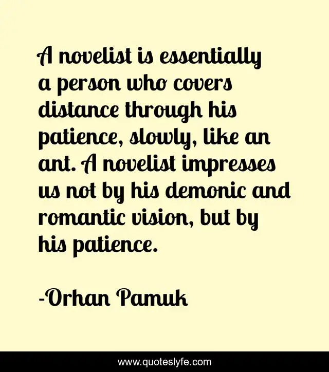 This page presents the quote "A novelist is essentially a person who covers distance through his patience, slowly, like an ant. A novelist impresses us not by his demonic and romantic vision, but by his patience.". Author of this quote is Orhan Pamuk. This quote is about patience, novelist, writing-process, orhan-pamuk, writing,.