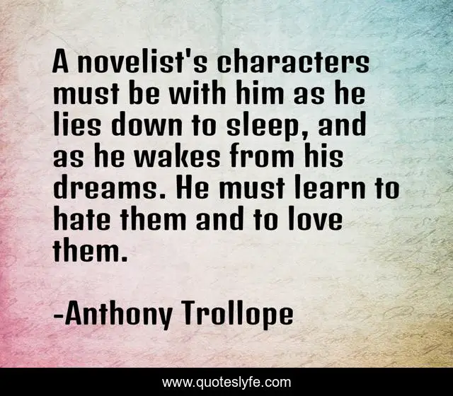 This page presents the quote "A novelist's characters must be with him as he lies down to sleep, and as he wakes from his dreams. He must learn to hate them and to love them.". Author of this quote is Anthony Trollope. This quote is about love, writer, writing, write, sleep, dreams, characters, wake, novelist,.