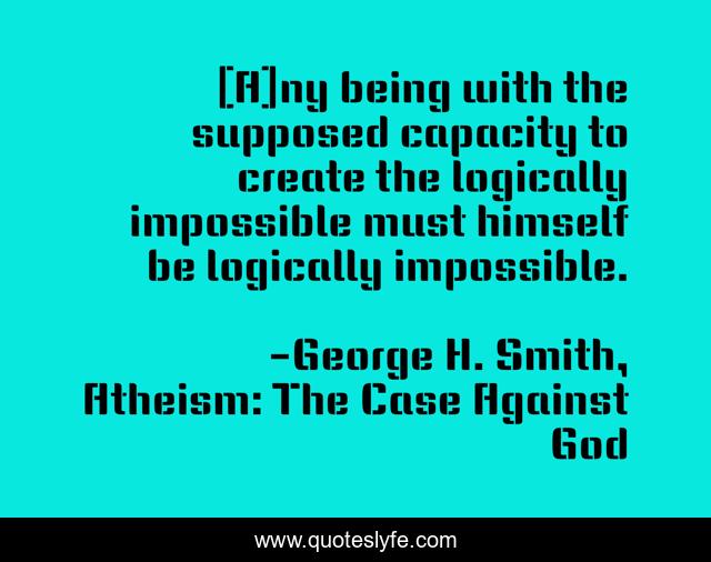 This page presents the quote "[A]ny being with the supposed capacity to create the logically impossible must himself be logically impossible.". Author of this quote is George H. Smith, Atheism: The Case Against God. This quote is about atheism, reason, philosophy, logic,.
