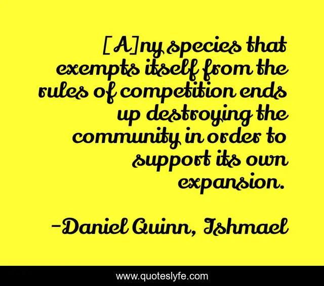 This page presents the quote "[A]ny species that exempts itself from the rules of competition ends up destroying the community in order to support its own expansion.". Author of this quote is Daniel Quinn, Ishmael. This quote is about exploitation, ecology, philosophy,.