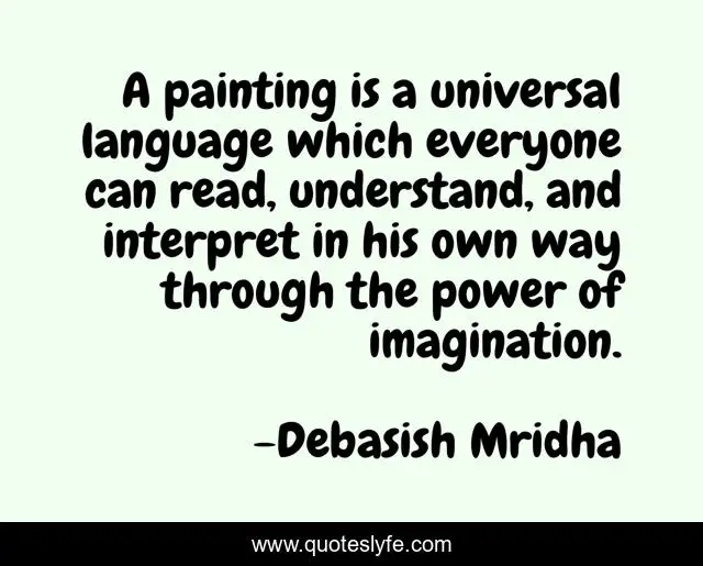 This page presents the quote "A painting is a universal language which everyone can read, understand, and interpret in his own way through the power of imagination.". Author of this quote is Debasish Mridha. This quote is about art, debasish-mridha, philosophy, what-is-art, quotes, debasish-mridha-md, inspirational, enthusiasm, painting,.
