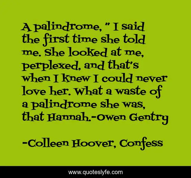 "Colleen Hoover, Confess Quotes." Quoteslyfe.com, 2025. Fri. 05 Dec. 2025. <https://www.quoteslyfe.com/quote/A-palindrome-I-said-the-first-time-256393>.
