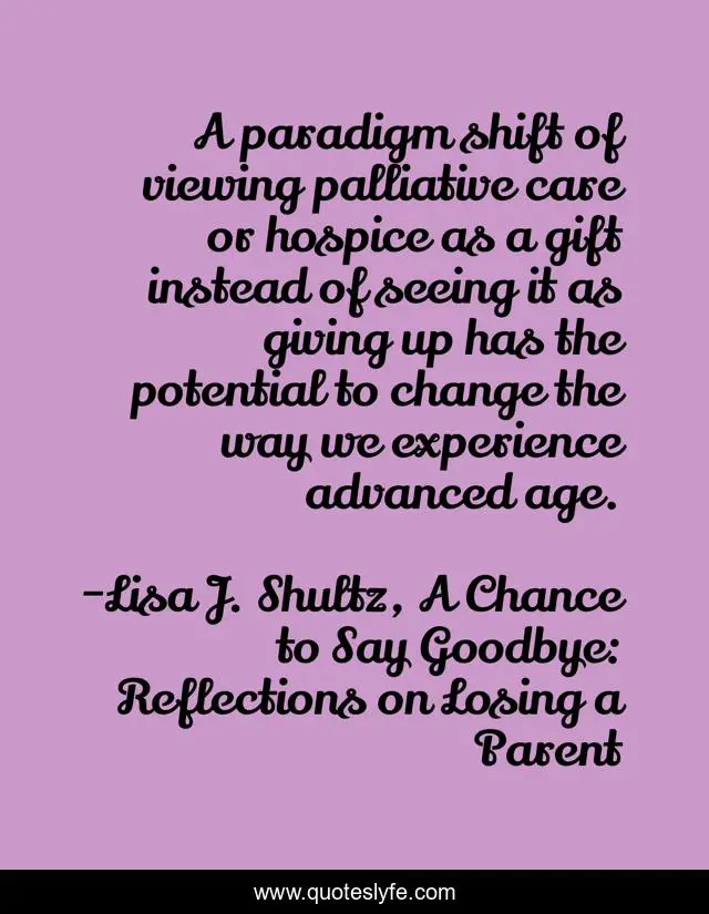 This page presents the quote "A paradigm shift of viewing palliative care or hospice as a gift instead of seeing it as giving up has the potential to change the way we experience advanced age.". Author of this quote is Lisa J. Shultz, A Chance to Say Goodbye: Reflections on Losing a Parent. This quote is about end-of-life-care, end-of-life-issues, paradigm-shift, hospice-care, end-of-life, palliative-care, death-of-a-loved-one, dying, hospice,.