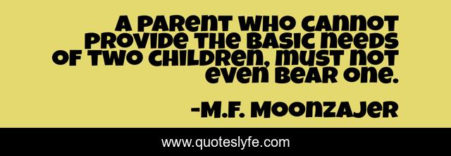 This page presents the quote "A parent who cannot provide the basic needs of two children, must not even bear one.". Author of this quote is M.F. Moonzajer. This quote is about bear, children, parent,.