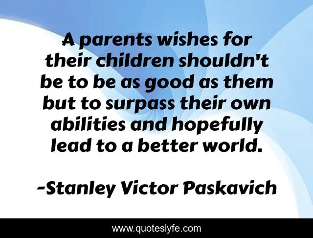 This page presents the quote "A parents wishes for their children shouldn't be to be as good as them but to surpass their own abilities and hopefully lead to a better world.". Author of this quote is Stanley Victor Paskavich. .