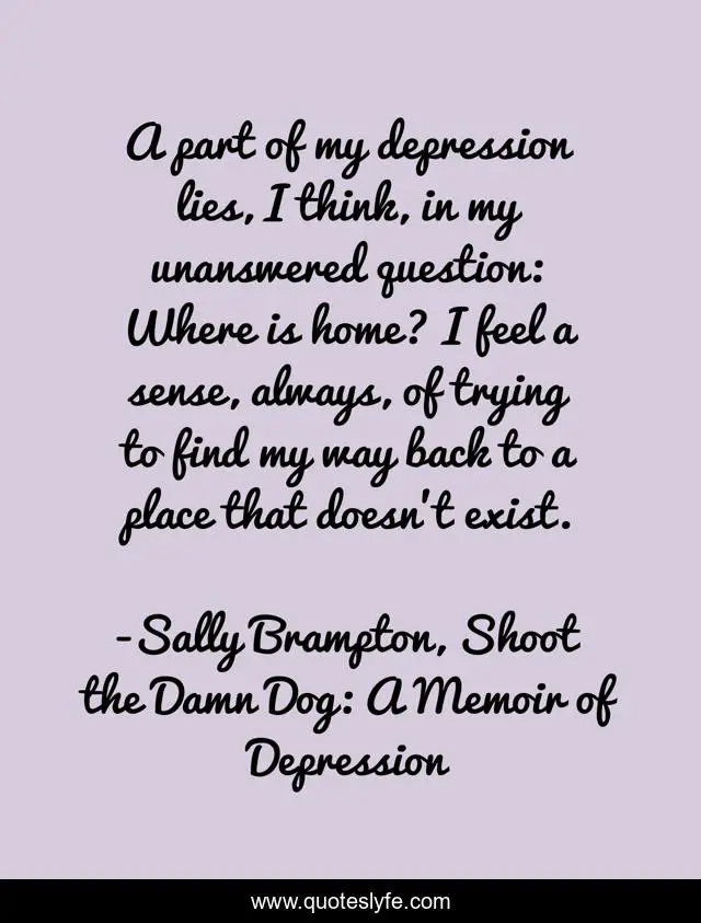 This page presents the quote "A part of my depression lies, I think, in my unanswered question: Where is home? I feel a sense, always, of trying to find my way back to a place that doesn't exist.". Author of this quote is Sally Brampton, Shoot the Damn Dog: A Memoir of Depression. This quote is about home, depression,.