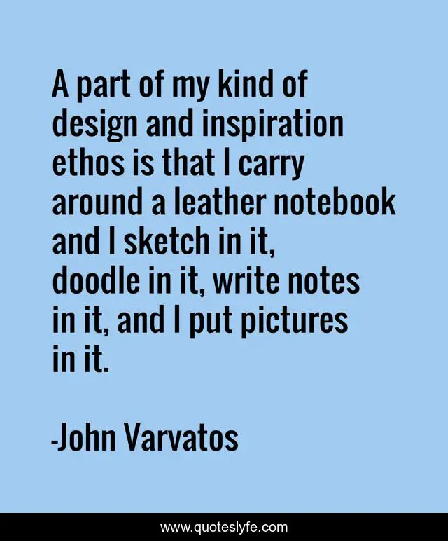 This page presents the quote "A part of my kind of design and inspiration ethos is that I carry around a leather notebook and I sketch in it, doodle in it, write notes in it, and I put pictures in it.". Author of this quote is John Varvatos. This quote is about leather, kind, inspiration,.