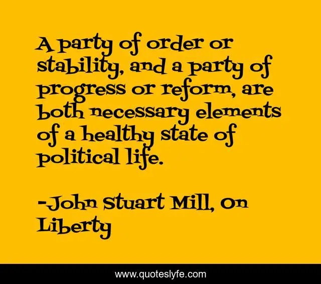 This page presents the quote "A party of order or stability, and a party of progress or reform, are both necessary elements of a healthy state of political life.". Author of this quote is John Stuart Mill, On Liberty. .