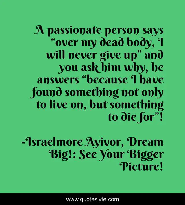 "Israelmore Ayivor, Dream Big!: See Your Bigger Picture! Quotes." Quoteslyfe.com, 2025. Sat. 06 Dec. 2025. <https://www.quoteslyfe.com/quote/A-passionate-person-says-over-my-dead-93019>.