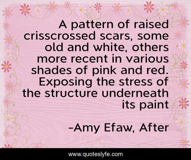 This page presents the quote "A pattern of raised crisscrossed scars, some old and white, others more recent in various shades of pink and red. Exposing the stress of the structure underneath its paint". Author of this quote is Amy Efaw, After. This quote is about stress, cutting, self-harm,.