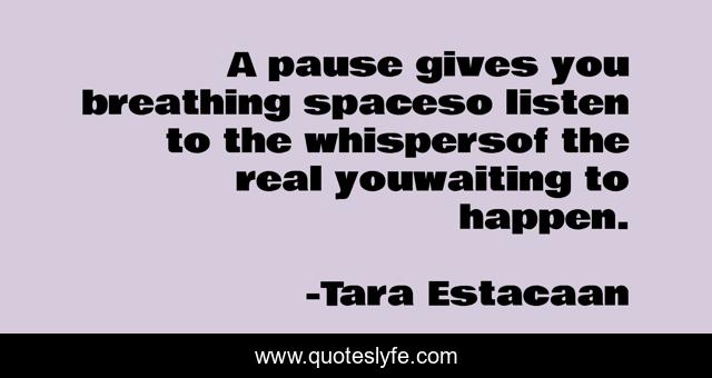 This page presents the quote "A pause gives you breathing spaceso listen to the whispersof the real youwaiting to happen.". Author of this quote is Tara Estacaan. This quote is about restore, pause, breathing-in-awareness, reflections, breaking-dawn, alone, silence,.