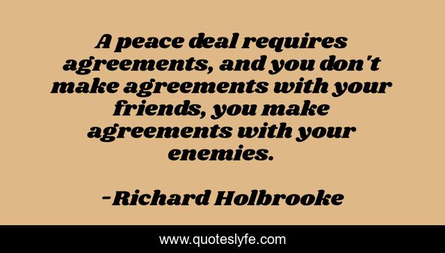 This page presents the quote "A peace deal requires agreements, and you don't make agreements with your friends, you make agreements with your enemies.". Author of this quote is Richard Holbrooke. This quote is about friends, enemies,.