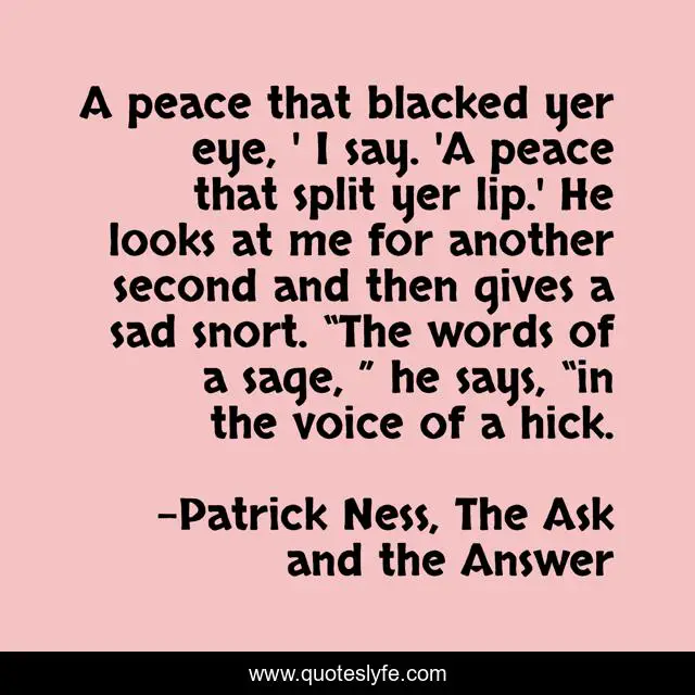 This page presents the quote "A peace that blacked yer eye, ' I say. 'A peace that split yer lip.' He looks at me for another second and then gives a sad snort. “The words of a sage, ” he says, “in the voice of a hick.". Author of this quote is Patrick Ness, The Ask and the Answer. This quote is about peace, chaos-walking, patrick-ness, todd-hewitt, the-ask-and-the-answer, politics,.