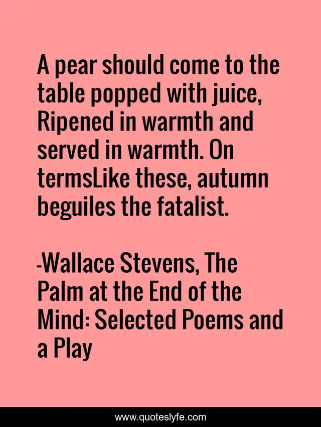 This page presents the quote "A pear should come to the table popped with juice, Ripened in warmth and served in warmth. On termsLike these, autumn beguiles the fatalist.". Author of this quote is Wallace Stevens, The Palm at the End of the Mind: Selected Poems and a Play. This quote is about poets, poetry,.