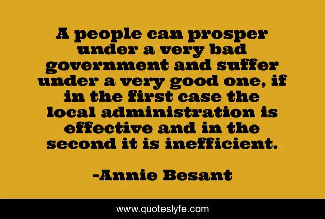 This page presents the quote "A people can prosper under a very bad government and suffer under a very good one, if in the first case the local administration is effective and in the second it is inefficient.". Author of this quote is Annie Besant. This quote is about bad, good, people,.
