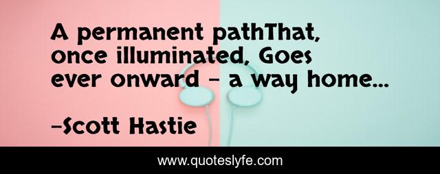This page presents the quote "A permanent pathThat, once illuminated, Goes ever onward – a way home…". Author of this quote is Scott Hastie. This quote is about illuminate, illuminated, onward, poetry, wisdom, permanent, way, home, path,.