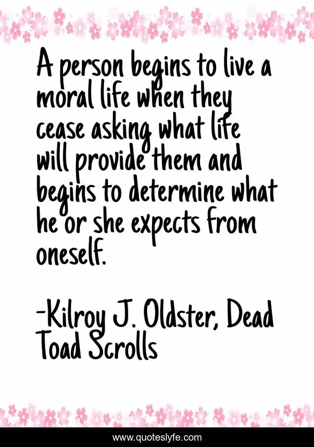 This page presents the quote "A person begins to live a moral life when they cease asking what life will provide them and begins to determine what he or she expects from oneself.". Author of this quote is Kilroy J. Oldster, Dead Toad Scrolls. This quote is about self-determination, personal-accountability, self-improvement, self-development, personal-growth,.