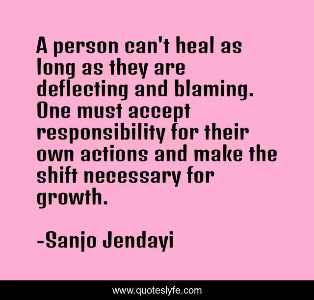 This page presents the quote "A person can't heal as long as they are deflecting and blaming. One must accept responsibility for their own actions and make the shift necessary for growth.". Author of this quote is Sanjo Jendayi. This quote is about deflecting, sanjo-jendayi, heal, accept, blame, growth, responsibility, shift,.