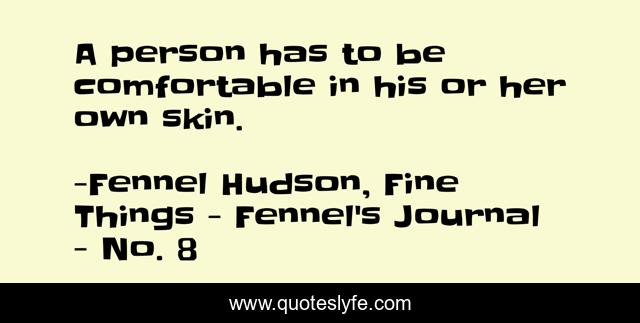 This page presents the quote "A person has to be comfortable in his or her own skin.". Author of this quote is Fennel Hudson, Fine Things - Fennel's Journal - No. 8. This quote is about confidence, character, self, identity, personality,.