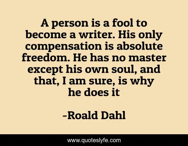 This page presents the quote "A person is a fool to become a writer. His only compensation is absolute freedom. He has no master except his own soul, and that, I am sure, is why he does it". Author of this quote is Roald Dahl. .