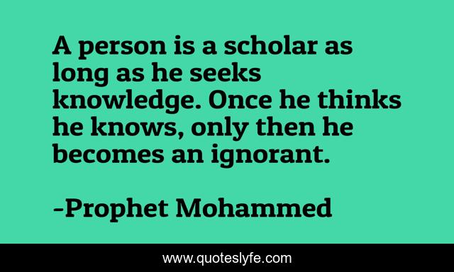 This page presents the quote "A person is a scholar as long as he seeks knowledge. Once he thinks he knows, only then he becomes an ignorant.". Author of this quote is Prophet Mohammed. This quote is about education, knowledge, learning,.