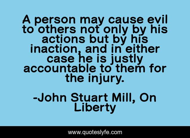 This page presents the quote "A person may cause evil to others not only by his actions but by his inaction, and in either case he is justly accountable to them for the injury.". Author of this quote is John Stuart Mill, On Liberty. This quote is about responsibility, action, ethics, injury, inaction, morality,.