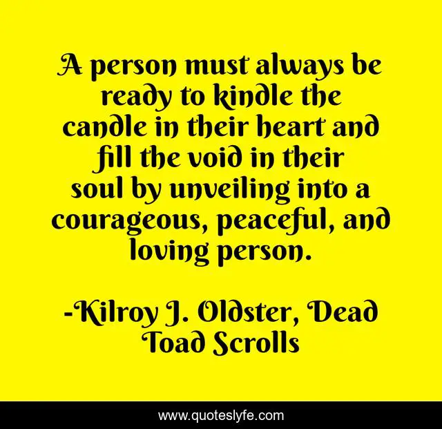 This page presents the quote "A person must always be ready to kindle the candle in their heart and fill the void in their soul by unveiling into a courageous, peaceful, and loving person.". Author of this quote is Kilroy J. Oldster, Dead Toad Scrolls. This quote is about bliss, blissful, enlightenment, enlightenment-principles, loving-people,.