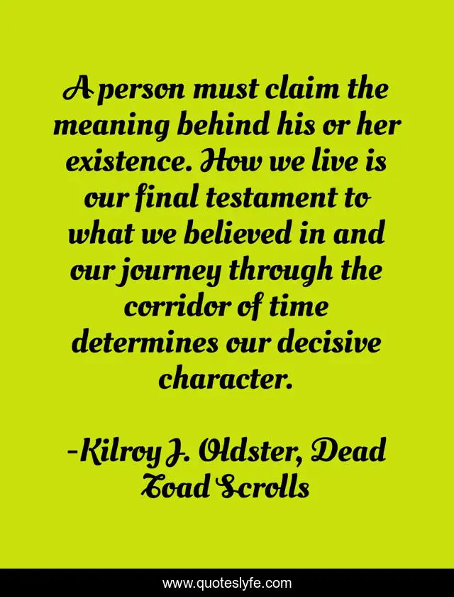 This page presents the quote "A person must claim the meaning behind his or her existence. How we live is our final testament to what we believed in and our journey through the corridor of time determines our decisive character.". Author of this quote is Kilroy J. Oldster, Dead Toad Scrolls. This quote is about meaningful-living, meaningful-life, meaningful, character, purpose-in-life, meaning, purpose, purpose-driven-life, purposeful-living,.