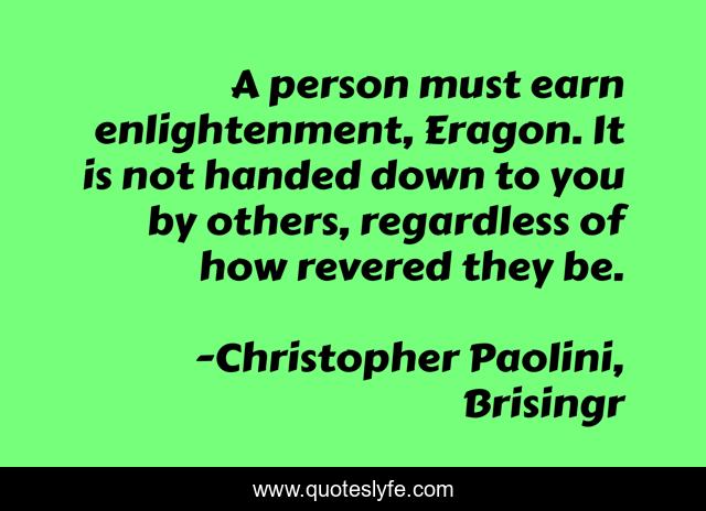 This page presents the quote "A person must earn enlightenment, Eragon. It is not handed down to you by others, regardless of how revered they be.". Author of this quote is Christopher Paolini, Brisingr. This quote is about teaching, enlightenment, knowledge,.