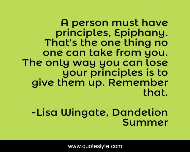 This page presents the quote "A person must have principles, Epiphany. That's the one thing no one can take from you. The only way you can lose your principles is to give them up. Remember that.". Author of this quote is Lisa Wingate, Dandelion Summer. .