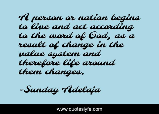 This page presents the quote "A person or nation begins to live and act according to the word of God, as a result of change in the value system and therefore life around them changes.". Author of this quote is Sunday Adelaja. This quote is about life, nation, person, value-system, word-of-god, result, change,.
