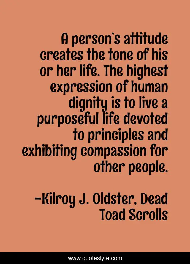 This page presents the quote "A person’s attitude creates the tone of his or her life. The highest expression of human dignity is to live a purposeful life devoted to principles and exhibiting compassion for other people.". Author of this quote is Kilroy J. Oldster, Dead Toad Scrolls. This quote is about dignity, empathy, attitude-towards-life, compassion, empathy-for-others, compassionate, attitude, behaviour, purpose-in-life,.