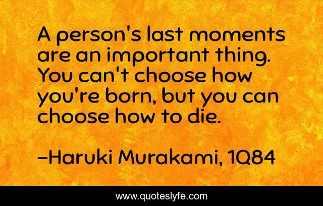 This page presents the quote "A person's last moments are an important thing. You can't choose how you're born, but you can choose how to die.". Author of this quote is Haruki Murakami, 1Q84. This quote is about born, die,.