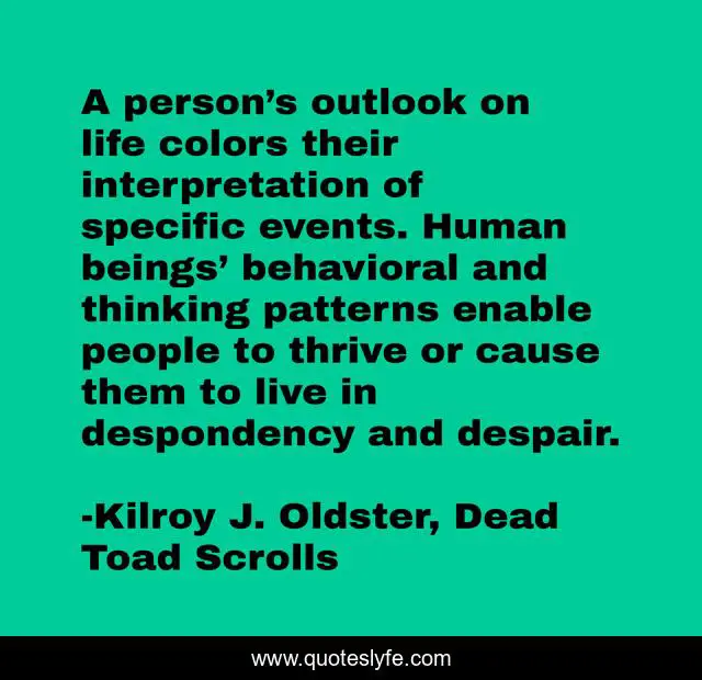 "Kilroy J. Oldster, Dead Toad Scrolls Quotes." Quoteslyfe.com, 2025. Mon. 08 Dec. 2025. <https://www.quoteslyfe.com/quote/A-person-s-outlook-on-life-colors-77899>.